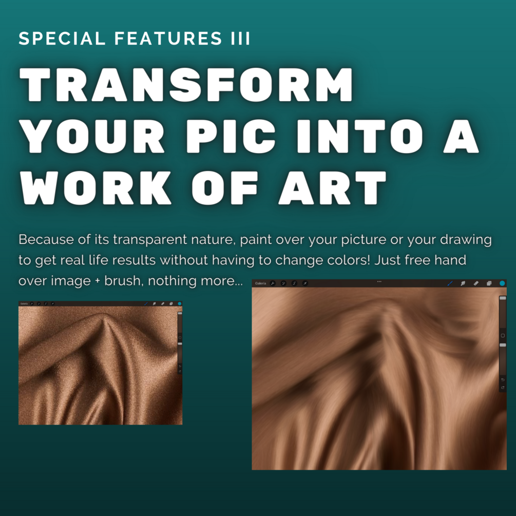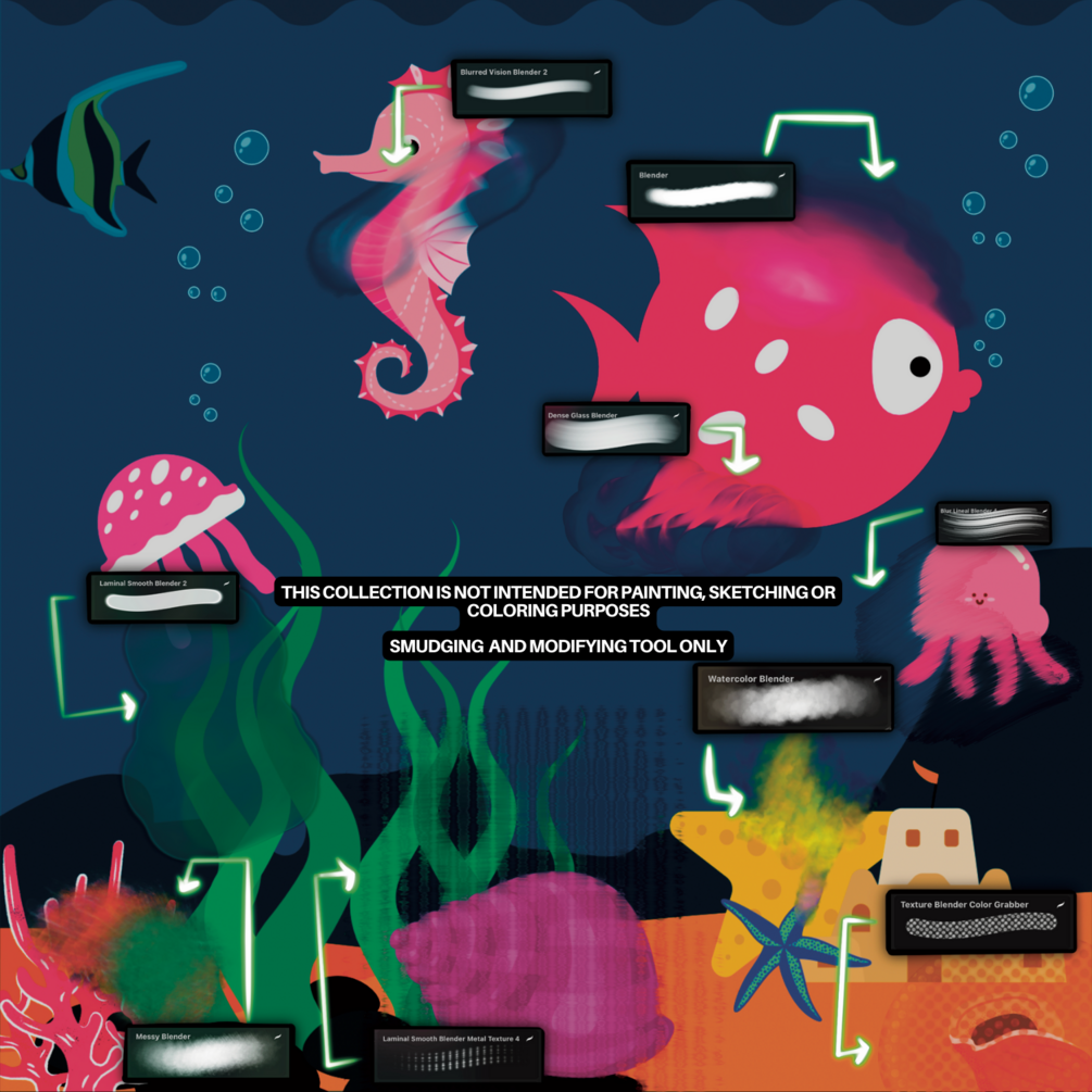 Note: those are transparent brushes that work in a different way than the usual smudge tool that comes as default on procreate. It works by dragging the colors and not vanishing them into the stroke. They will NOT change as you change between color hues. They will not work on an empty canvas.