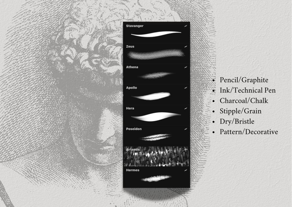 A curated set of 70+ professional brushes inspired by ancient Greek, Roman, and Nordic heritage.