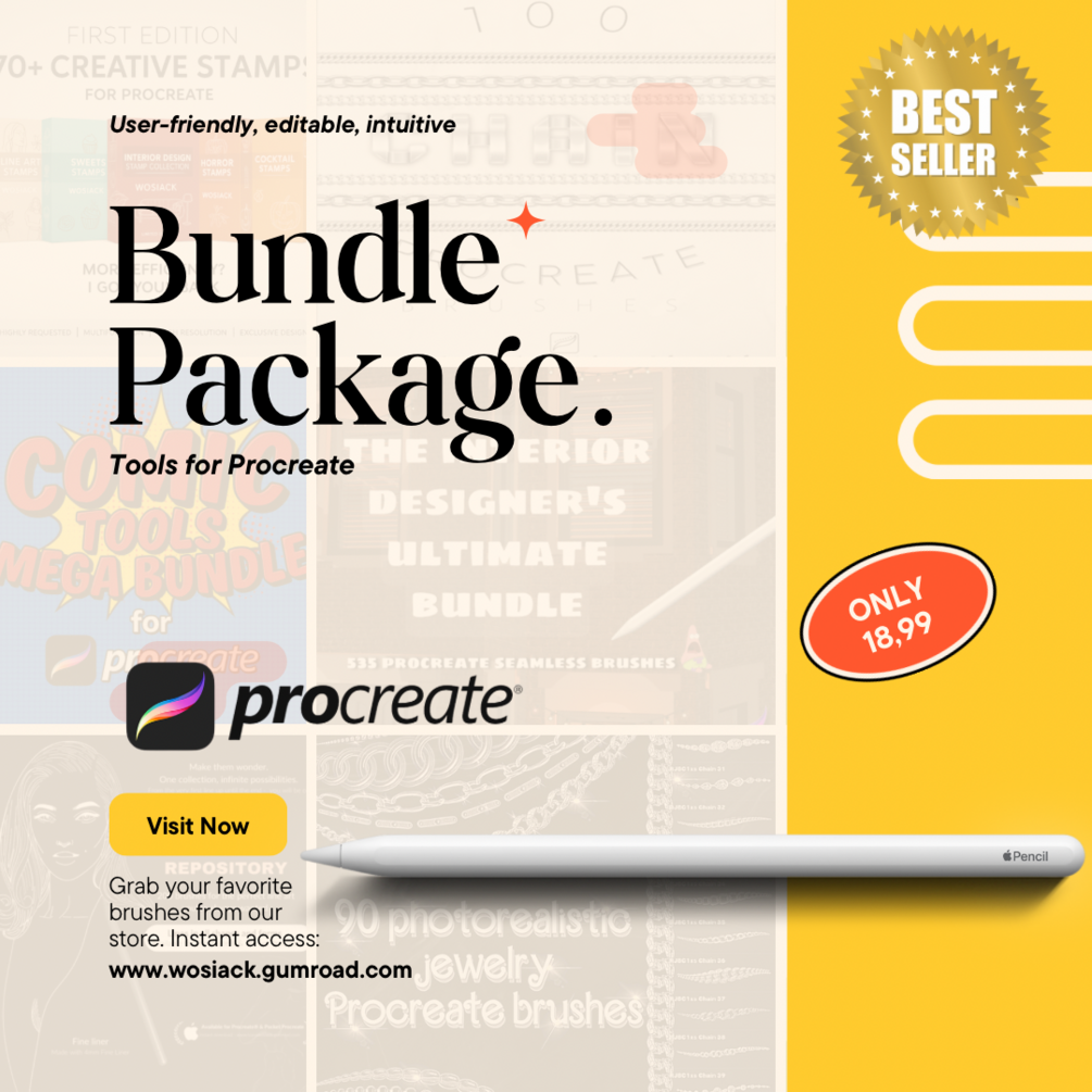 A complete Procreate toolkit in one place: textures, effects, portraits, fashion, nature, patterns and more.
