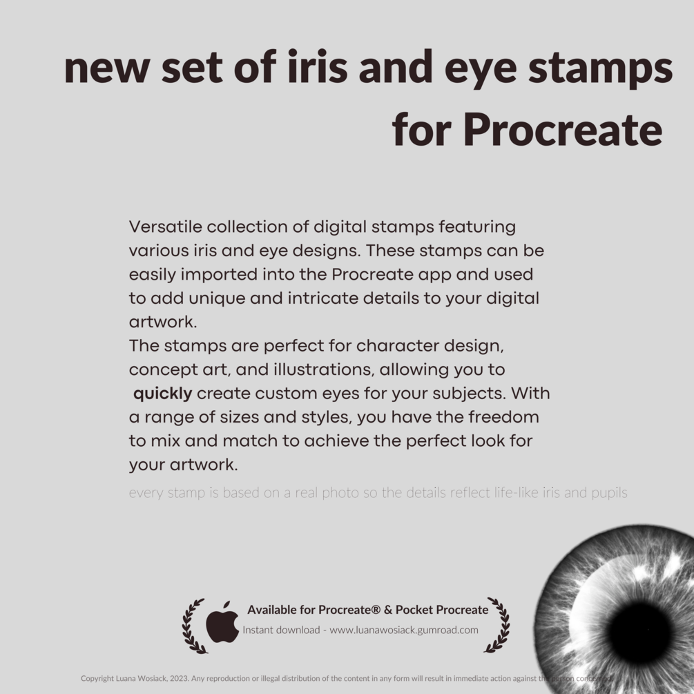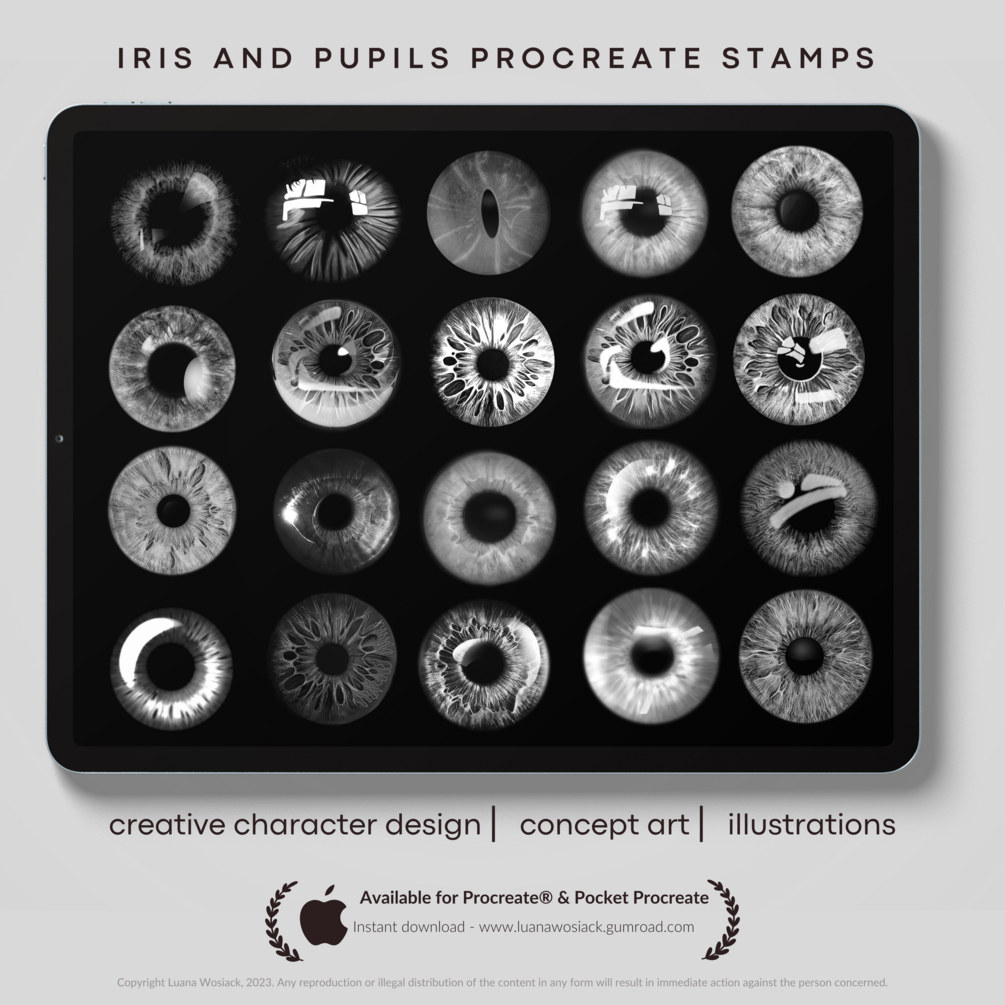 Introducing our new set of 50 iris and pupil stamps for Procreate! Whether you're creating portraits, illustrations, or concept art, these stamps will add a touch of realism and character to your work. With a variety of iris and pupil shapes, sizes, and colors, you'll never run out of options to make your artwork stand out. Our stamps are easy to use and perfect for all skill levels. So what are you waiting for? Enhance your digital art creations with our new set of iris and pupil stamps today!