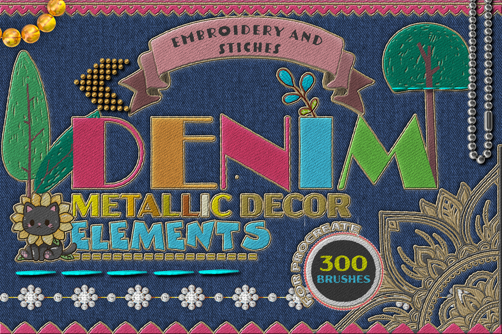 From cute characters and stitched borders to sparkling chains and gold-thread mandalas, DENIM gives you everything you need to create rich, layered illustrations with personality.